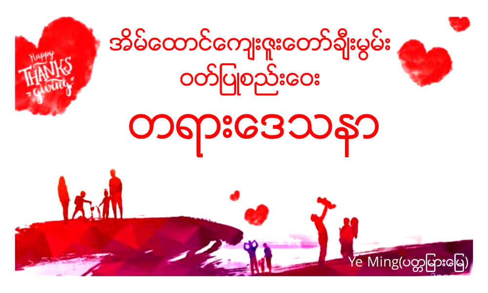အားလုံးခရစ်တော်၌ငြိမ်သက်ခြင်းရှိပါစေ။ဒီနေ့ဟာ”ဦး…ဒေါ်…”အိမ်ထောင်မိသားစုရဲ့ကျေးဇူးတော်ချီးမွမ်းခြင်းဝတ်ပြုစည်းဝေးဘဲဖြစ်ပါတယ်၊ကျေးဇူးတော်ချီးမွမ်းခြင်းယဇ်လို့ပြောလိုက်တဲ့အခါဘုရားသခင်ရဲ့အလိုတော်ဖြစ်သလိုယုံကြည်သူတိုင်းလုပ်ရမယ့်အရာတခုလဲဖြစ်ပါတယ်။ဘာကြောင့်လဲဆိုတော့ဒီလိုကျေးဇူးတော်ချီးမွမ်းခြင်းယဇ်ပူဇော်တတ်တဲ့လူတစ်ယောက်ဟာထပ်ဆင့်ကျေးဇူးတော်၇မျိုးခံစားရလိမ့်မယ်လို့သမ္မာကျမ်းစာကဖော်ပြထားလို့ဘဲဖြစ်ပါတယ်။ဒီနေ့အားလုံးနဲ့အတူဒီ၇ချက်ကိုတချက်ခြင်းလေ့လာခွန်အားယူချင်ပါတယ်။