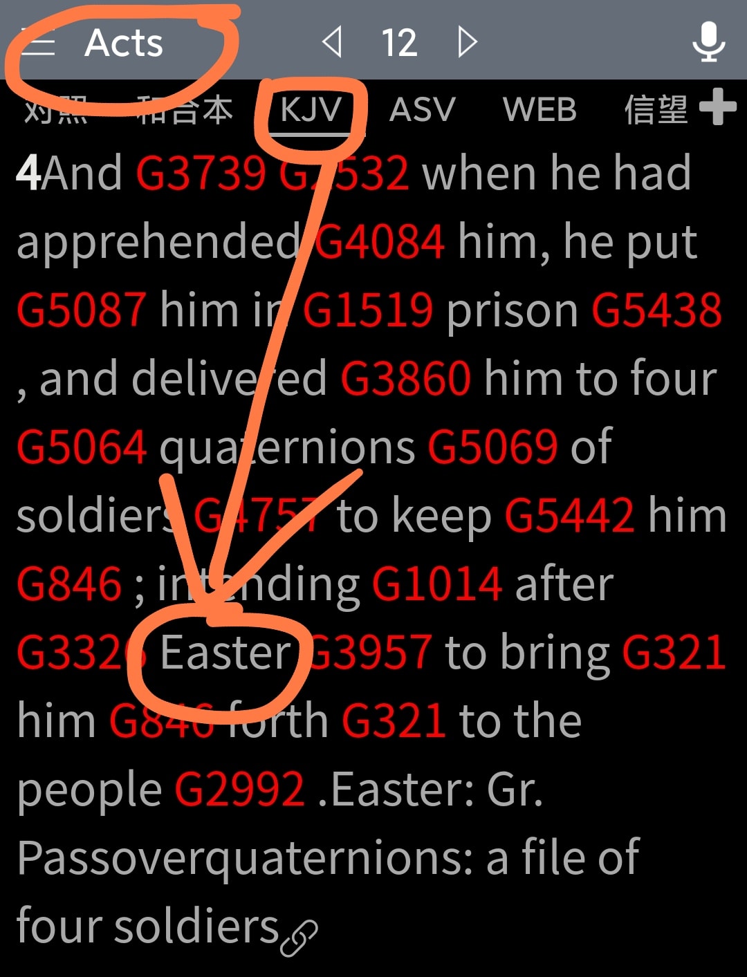 ဒီမှာဂျူးတွေရဲ့ပဿခါပွဲကိုKjvဗားရှင်းကEasterလို့ဘာသာပြန်သုံးထားပါတယ်။Easterကနတ်ဘုရားကိုဆိုလိုရင်kjvကပသခါဆိုတဲ့ဘုရားနဲ့ဆိုင်တဲ့ပွဲကိုသိသိကြီးနဲ့နတ်ဘုရားအဖြစ်ဘာသာပြန်မှားခဲ့လေသလား?kjvကသိသိကြီးဒီလောက်ကြီးတဲ့အမှားမျိုးကိုကျူးလွန်ခဲ့လေသလားဆိုတာလည်းတခါထဲဖြေကြည့်ပါ။