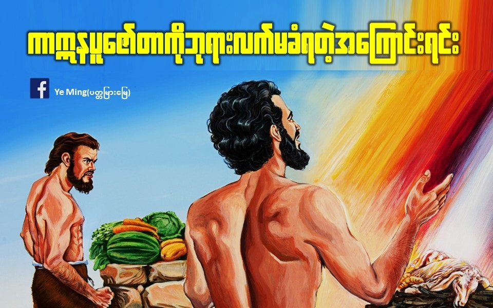 ကမ္ဘာဦးကျမ်း၄:၁-၇ထဲကကာဣနနဲ့အာဗေလယဇ်ပူဇော်တဲ့အရာနဲ့ပတ်သက်ပြီး၊အာဗေလကအသွေးပါတဲ့သိုးနဲ့ယဇ်ပူဇော်လို့ဘုရားလက်ခံတယ်၊ကာဣနကတော့အသွေးမပါတဲ့ မြေအသီးတွေကိုသာပူဖော်လို့ဘုရားလက်မခံတာဆိုပြီး၊(ဟေဗြဲ၉:၂၂အရအသွေးမသွန်းရင်အပြစ်မလွတ်ဘူးဆိုပြီး)၊မြောက်များစွာသောအမှုတော်ဆောင်တွေဟာမှားယွင်းစွာအနက်ပြန်နေကြတာလို့ကျနော်ခံယူမိတာမို့၊အနည်းငယ်ဖြေရှင်းပါရစေ။
